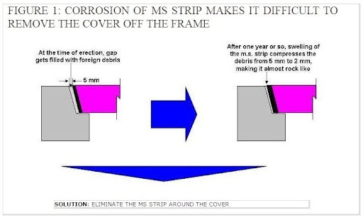 Removed the metal strip around the cover to eliminate rust swelling and ensure easy removal.